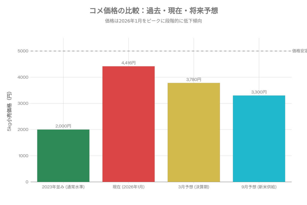第一に3月の決算期で3,780円程度への下落、第二に6月の在庫調整期で3,000円台後半、そして第三に9月の新米供給開始で3,300円程度まで下がる見通しです。これが実現すれば、最高値5,002円から約34%の大幅下落となります。