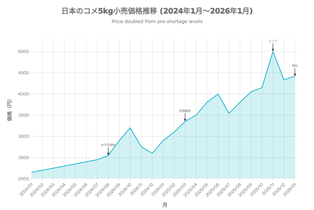 パニック的な買い溜めで5,002円まで高騰した米は、豊作による供給回復で過剰在庫329万トンという逆の問題に直面しています 。それでもスーパーの店頭では4,400円超の高値が続く理由は、流通段階での「価格の目詰まり」です 。